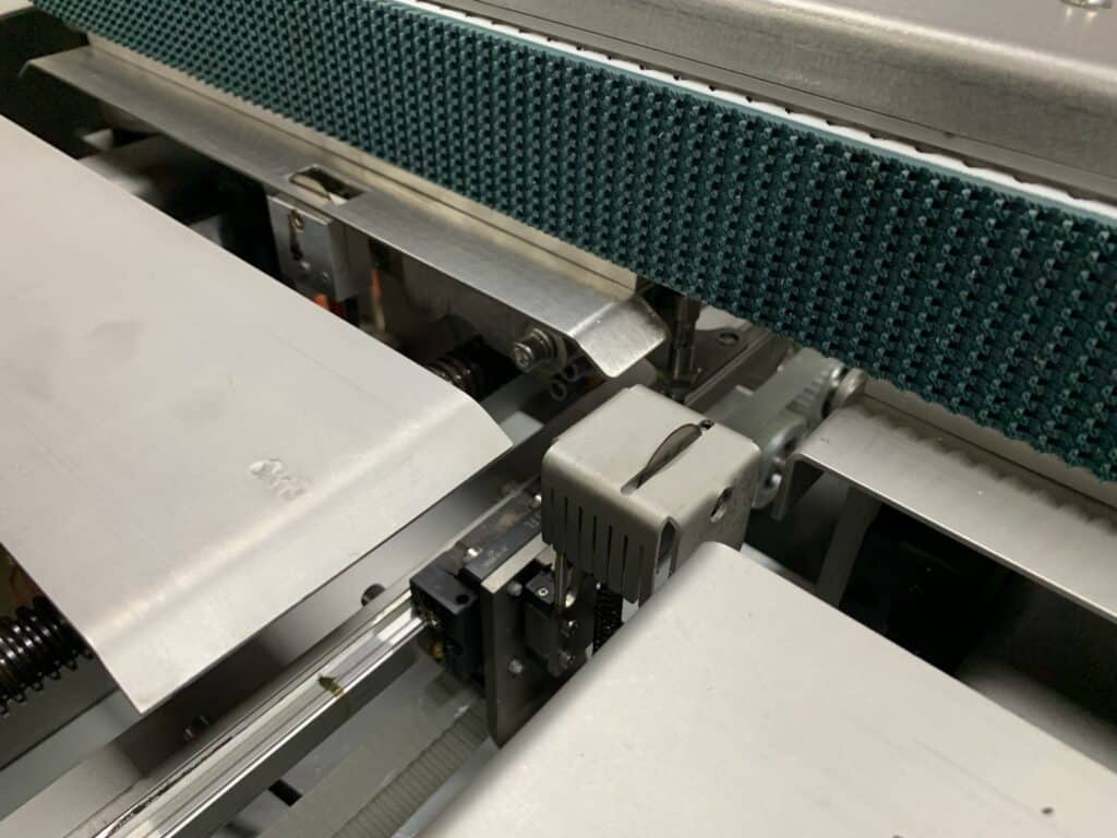 Onze oplossing is iets om trots op te zijn. We hebben ervoor gekozen om de trays in de machine te transporteren met behulp van twee zijdelingse transportbanden. Binnenin de machine bevinden zich drie messen die de krimpfolie aan de onderkant van de doos doorsnijden zonder schade toe te brengen aan het karton erachter. Dit is bijzonder belangrijk voor bepaalde producten, gezien het feit dat de trays hergebruikt worden.